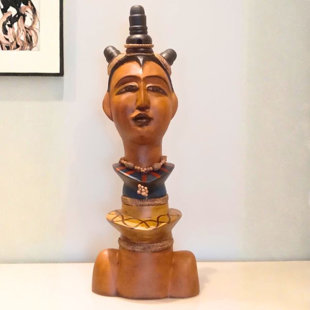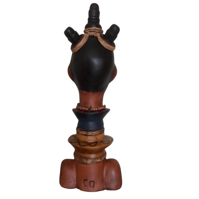 O design apresenta um busto de pescoço alongado, adornado com um colar de miçangas em tons de azul e dourado. O toucado alto e os pequenos coques laterais conferem um porte majestoso. Ideal para colecionadores e para quem deseja adicionar um toque de força, ancestralidade e elegância tribal à decoração.