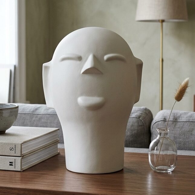 Esta cabeça de cerâmica foi pensada para se adaptar com elegância a diversos espaços: