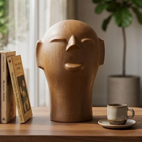 Esta cabeça de cerâmica foi pensada para se adaptar com elegância a diversos espaços: