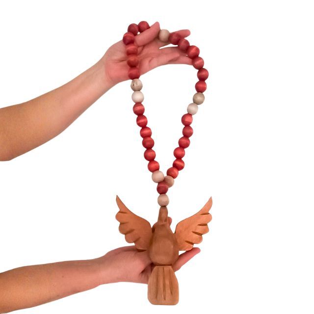 - Design: Composto por contas de madeira maciça, pintadas em tons de vermelho e cru, culminando em um pingente robusto e detalhado do Espírito Santo.