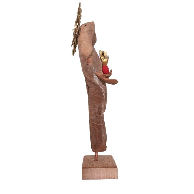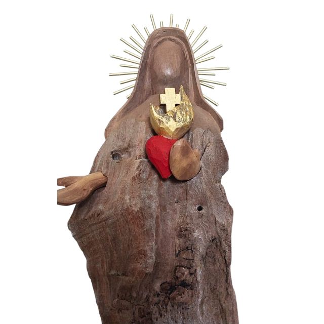 Sagrado Coração de Maria: Escultura de arte sacra, rústica e elegante. Esculpida artesanalmente em restos de tronco de madeira, celebra a fé com a beleza e as texturas únicas do material natural de reuso.