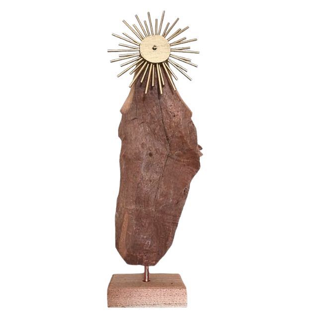 Esculpida manualmente a partir de restos de tronco de madeira, cada peça carrega a história e as marcas únicas da natureza. O artista transformou o material rústico em uma representação singela e poderosa da Virgem Maria, mantendo a textura original da madeira para agregar um charme atemporal e autêntico.