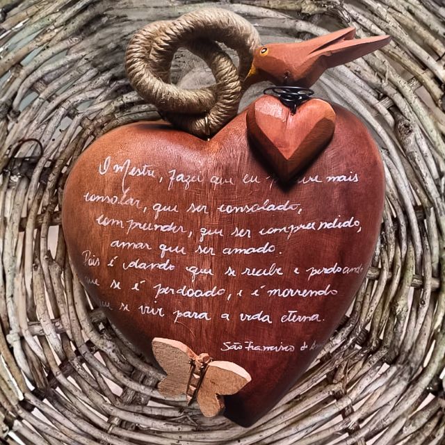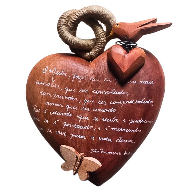 • Design: Coração de madeira maciça, em tom natural, com a Oração de São Francisco.