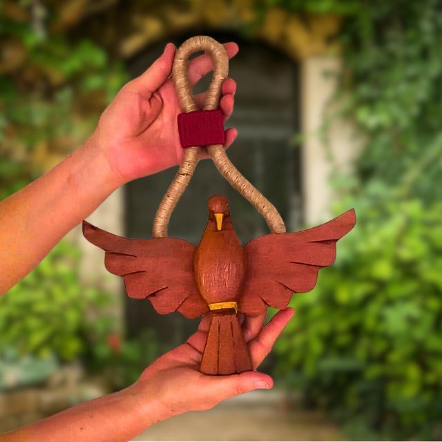 - Design: Pomba do Divino Espírito Santo em madeira, com tom natural e acabamento rústico que realça a beleza do entalhe.