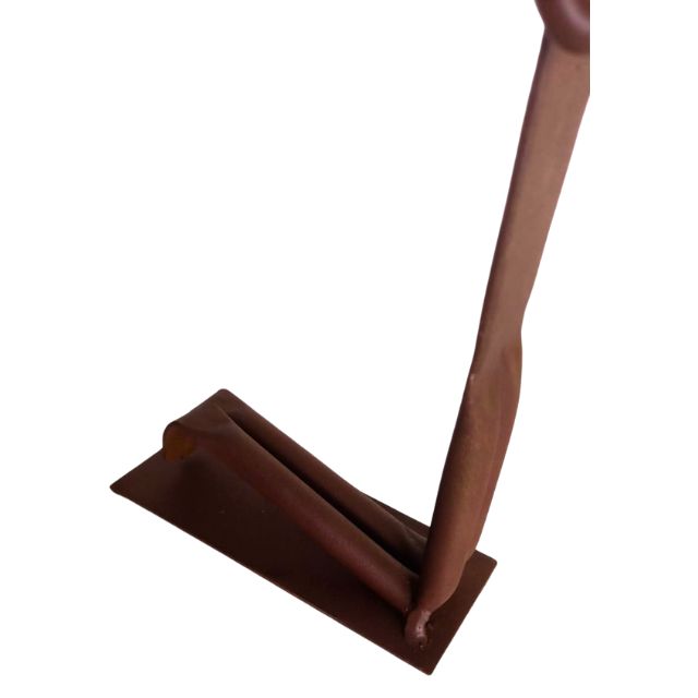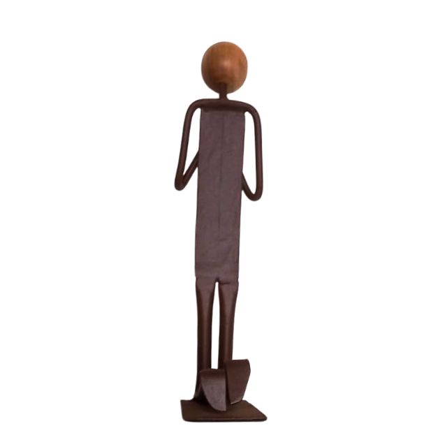 Produzida de forma artesanal com a combinação elegante de ferro (que confere a estrutura e durabilidade) e madeira (para a cabeça e detalhes, trazendo um toque de humanidade e calor). A tonalidade do metal e da madeira pode sofrer pequenas alterações, o que garante a exclusividade e singularidade de cada peça.