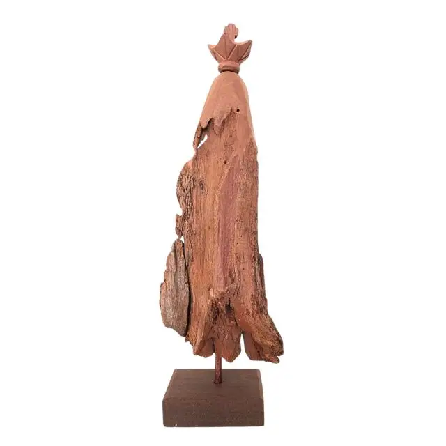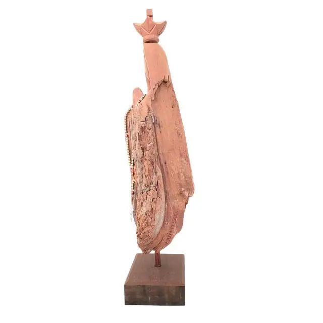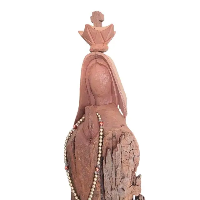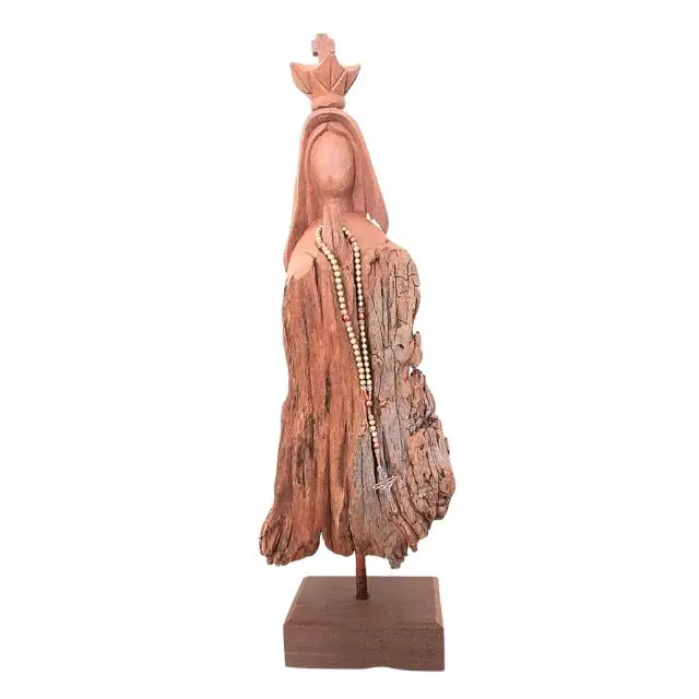 Esculpida manualmente a partir de restos de tronco de madeira, cada peça carrega a história e as marcas únicas da natureza. O artista transformou o material rústico em uma representação singela e poderosa da Virgem Maria, mantendo a textura original da madeira para agregar um charme atemporal e autêntico.
