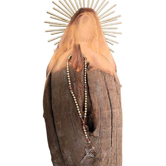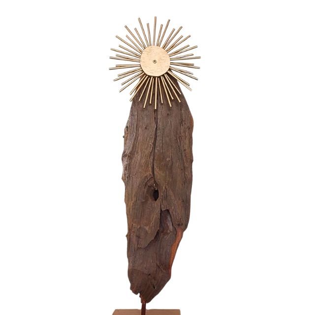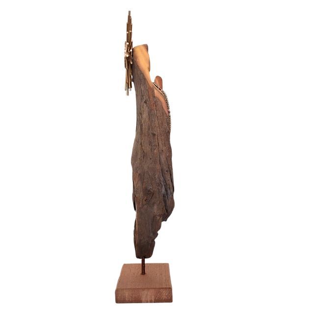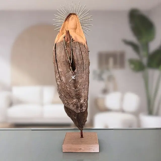 Esculpida manualmente a partir de restos de tronco de madeira, cada peça carrega a história e as marcas únicas da natureza. O artista transformou o material rústico em uma representação singela e poderosa da Virgem Maria, mantendo a textura original da madeira para agregar um charme atemporal e autêntico.