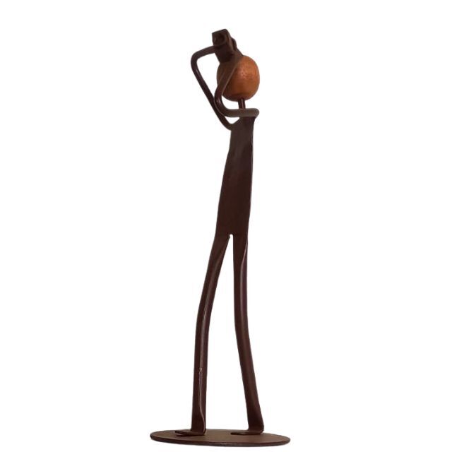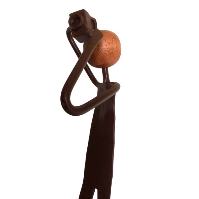 Produzida de forma artesanal com a combinação elegante de ferro (que confere a estrutura e modernidade) e madeira (para a cabeça e detalhes, trazendo um toque rústico e orgânico). A tonalidade do metal e da madeira pode sofrer pequenas alterações, o que garante a exclusividade e singularidade de cada peça.