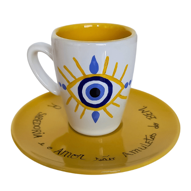 Xícara com Pires – Olho Grego – “A sabedoria e o amor são amuletos do bem” – Café Expresso