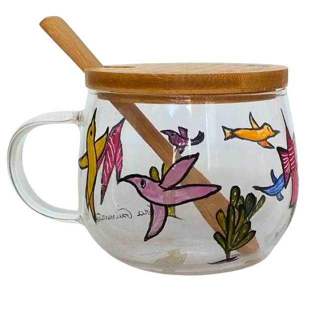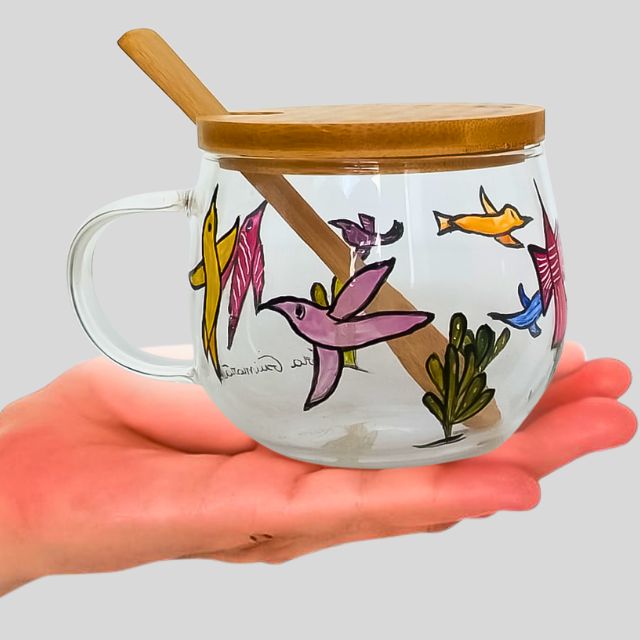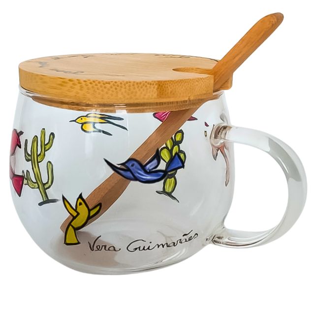 Xícara para chá de vidro, com capacidade de 350ml. Com uma linda pintura à mão, a xícara faz parte da exclusiva Coleção Cordel Encantado e acompanha tampa com a frase Permita-se Voar Alto, ambos em bambu.