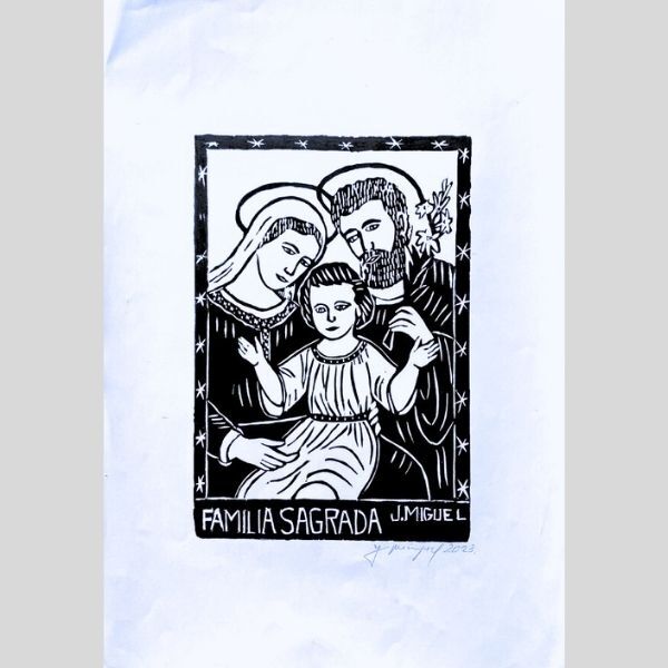 A xilogravura “Família Sagrada”, do mestre J. Miguel, é uma representação emocionante e atemporal dos valores de união, amor e fé. A peça, executada no clássico estilo preto e branco, evoca a pureza e a força dos ícones religiosos na arte popular nordestina.